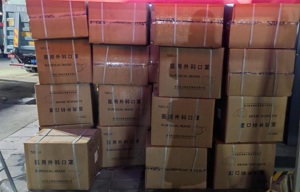11月5日,5万只医用外科口罩由专用运输车运送至学校,经严格消毒和静置隔离后,由志愿者运送至学校疫防物资仓库。