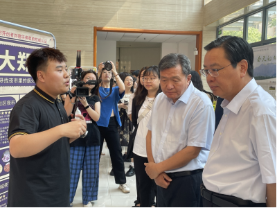 党委书记贾少鑫、副书记张宝强,组织部长刘学健,新闻与传播学院党委书记崔涛等领导的陪同下,省委第二十四巡回指导组组长、政协河南省委员会经济委员会副主任刘兴彬,指导组副组长、商丘市人大常委会副主任姬脉常,指导组成员、郑州轻工业大学人民武装部副部长刘振卫和新乡市委政策研究室、市政府发展研究中心副主任苏舸参观了新传学院的优秀毕业作品展。六月的早晨,阳光明媚。步入三号演播厅的前厅,绚烂纷呈的作品海报令人应接不暇,这是本次活动中的“优秀毕业设计展”。从新闻与传播学院研究生、播音与主持艺术系、广播电视编导系、广播电视学系、网络与新媒体系精心挑选出的十部优秀毕业作品以声、像、画的立体形象展示在观者面前。省委巡回指导组的领导们来到展区,观看优秀毕业作品展,细心倾听同学们的讲解,不时与同学们亲切交流,并对展览进行了充分的肯定。