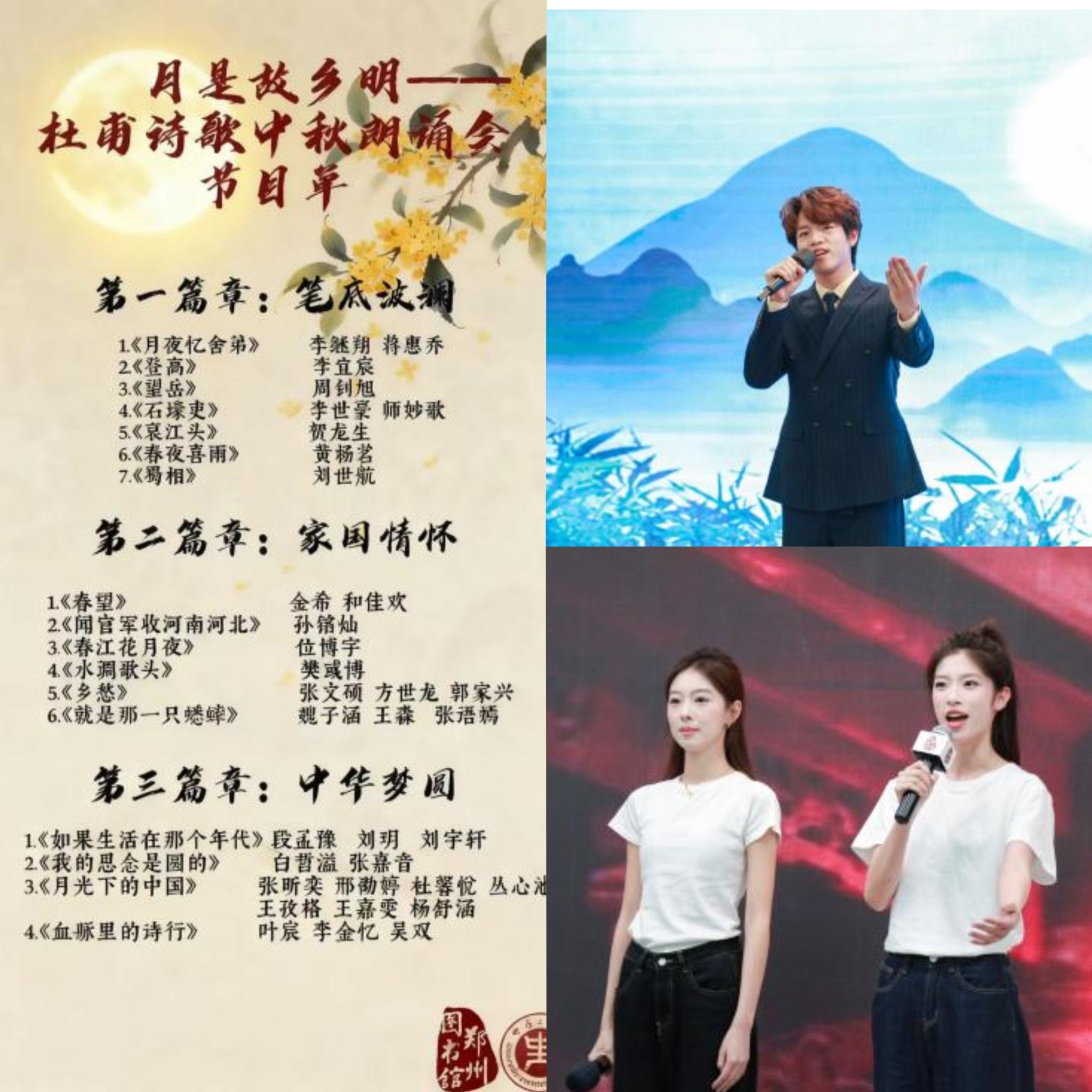 播音与主持艺术系联合主办的“何以诗圣”:月是故乡明——杜甫诗歌中秋朗诵会于郑州图书馆西三楼新闻发布厅举办,为市民呈现了一场穿越千年的诗歌盛宴。