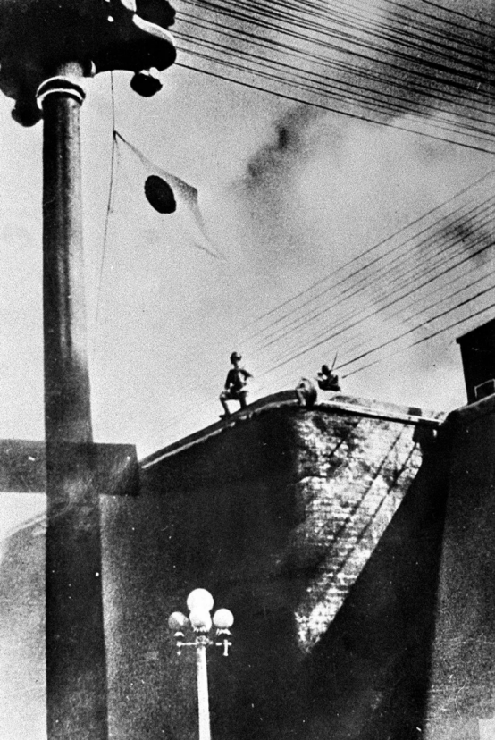 图为日军侵占沈阳城后,耀武扬威地站在城头,悬挂起日本国旗。