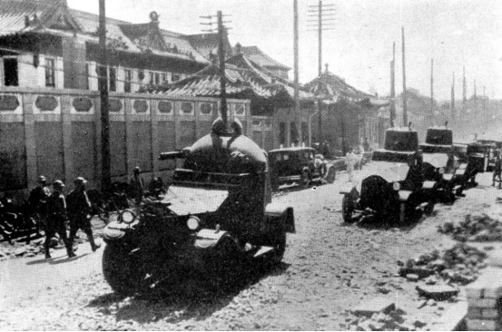 图为1931年9月19日,日本侵略军装甲部队侵入沈阳市。